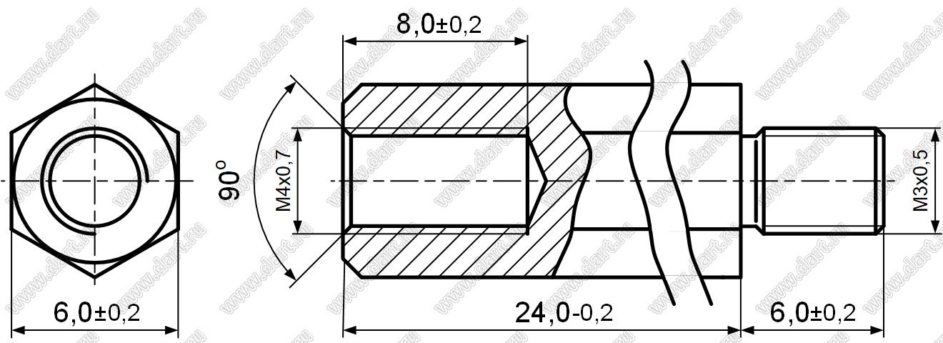 Стойка шестигранная с внутренней и наружной резьбами; с внутренней резьбой М4x0,7; с внешней резьбой М3x0,5; резьба внутр. M4x0,7; резьба внешн. M3x0,5; SW=6,0мм; L=24,0мм; L2=8,0мм; L3=6,0мм; латунь